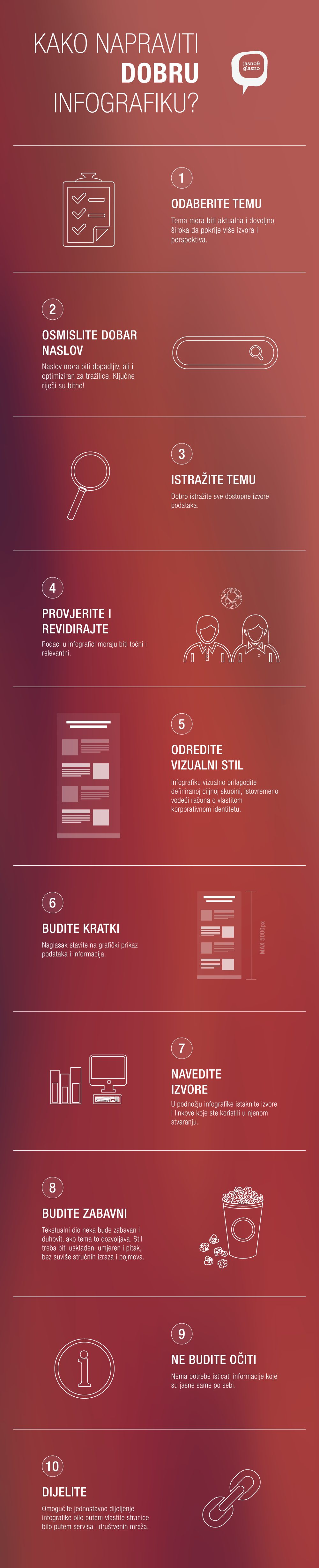 Izuzetno su popularne među korisnicima obzirom da se sastoje samo od najrelevantnijih poruka koje su konkretno i jednostavno te vizualno atraktivno prezentirane. Putem njih su ključne informacije lako uočljive i brže se pamte čime se umnogostručuje njihov potencijal za širenje među željenom publikom. Kako biste maksimizirali učinke koje želite postići vlastitim infografikama, donosimo vam 10 savjeta za njihovu što kvalitetniju izradu.