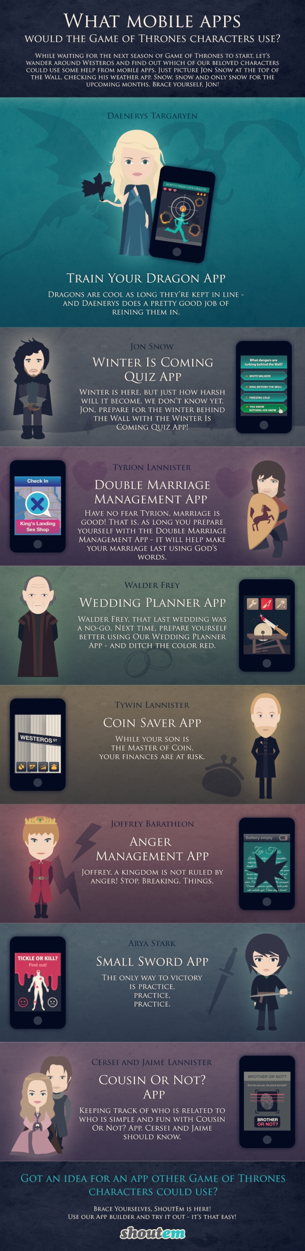 Za našeg njujorškog klijenta, tvrtku Shoutem, napravili smo zabavnu infografiku Koje bi mobilne aplikacije koristili junaci super popularne serije Game of Thrones! Samu infografiku izradila je odlična ilustratorica i dizajnerica s kojom često surađujemo, Maja Benčić iz Rijeke.